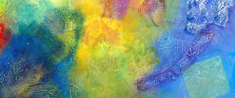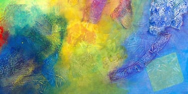 Acrylic, gesso and collage with origami paper on canvas, 36" x 42" (92 x 107 cm)